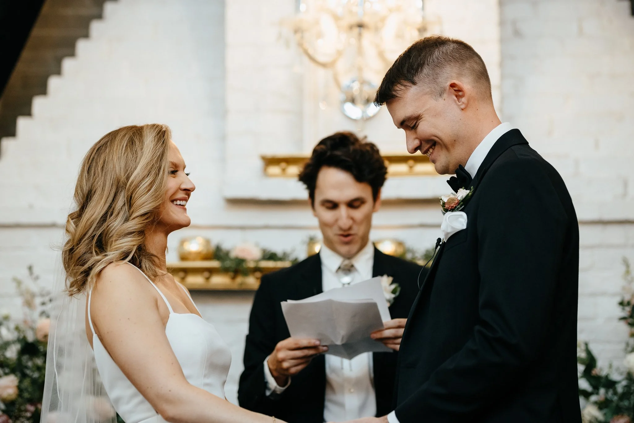 🎙️ Ceremony. I generally ask people to stand for the bride. I go for a slow, calm, crisp, and understated ceremony in 15 - 17 minutes. I tuck in asides, wink & nods, and inside jokes. I stand aside when the couple kisses for their picture and then introduce them how they’d like. I often conclude with an invitation to cocktails or dancing.